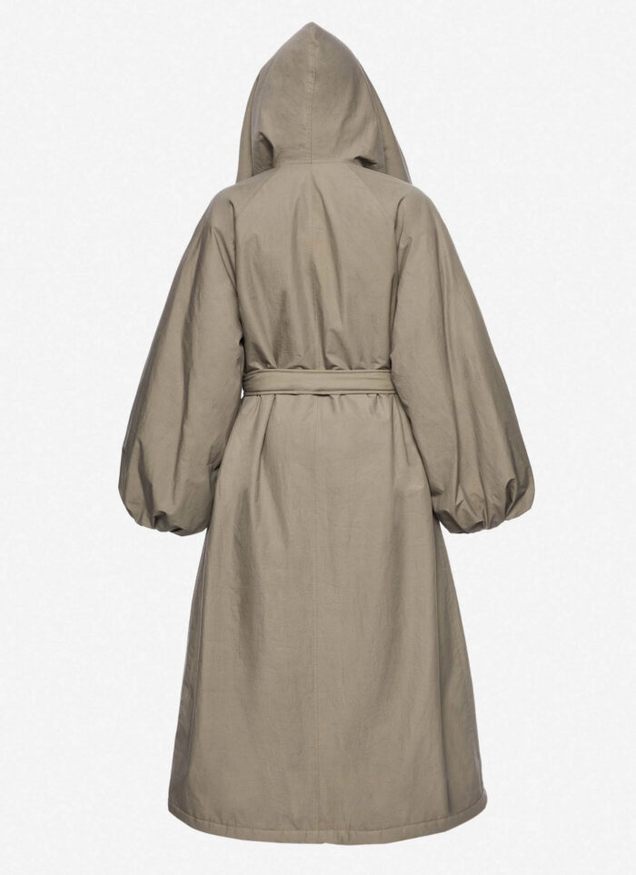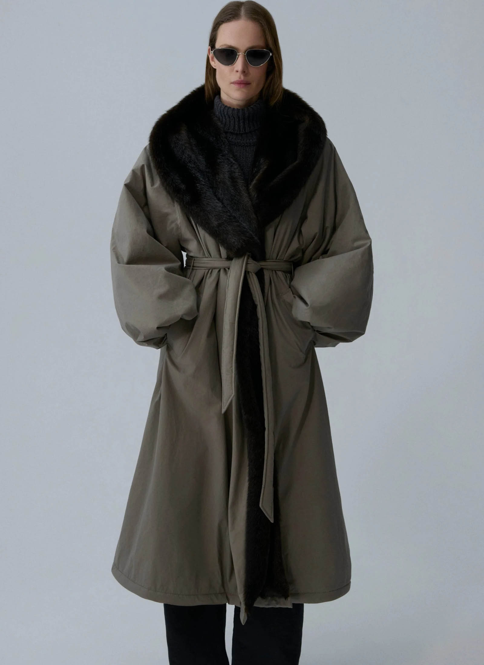 This long coat is crafted from silk and fully lined with faux fur. It features voluminous sleeves that gather at the cuffs, a hood, and a belt that cinches the waist instead of a traditional fastening. Functional front pockets complete this sophisticated, cocoon-like silhouette.