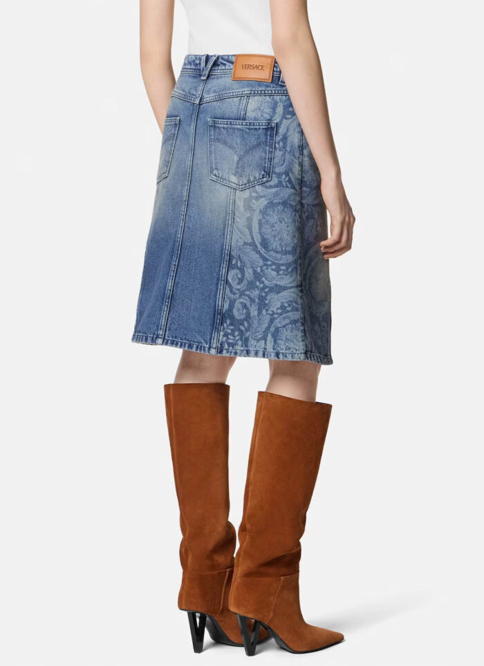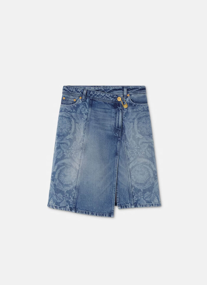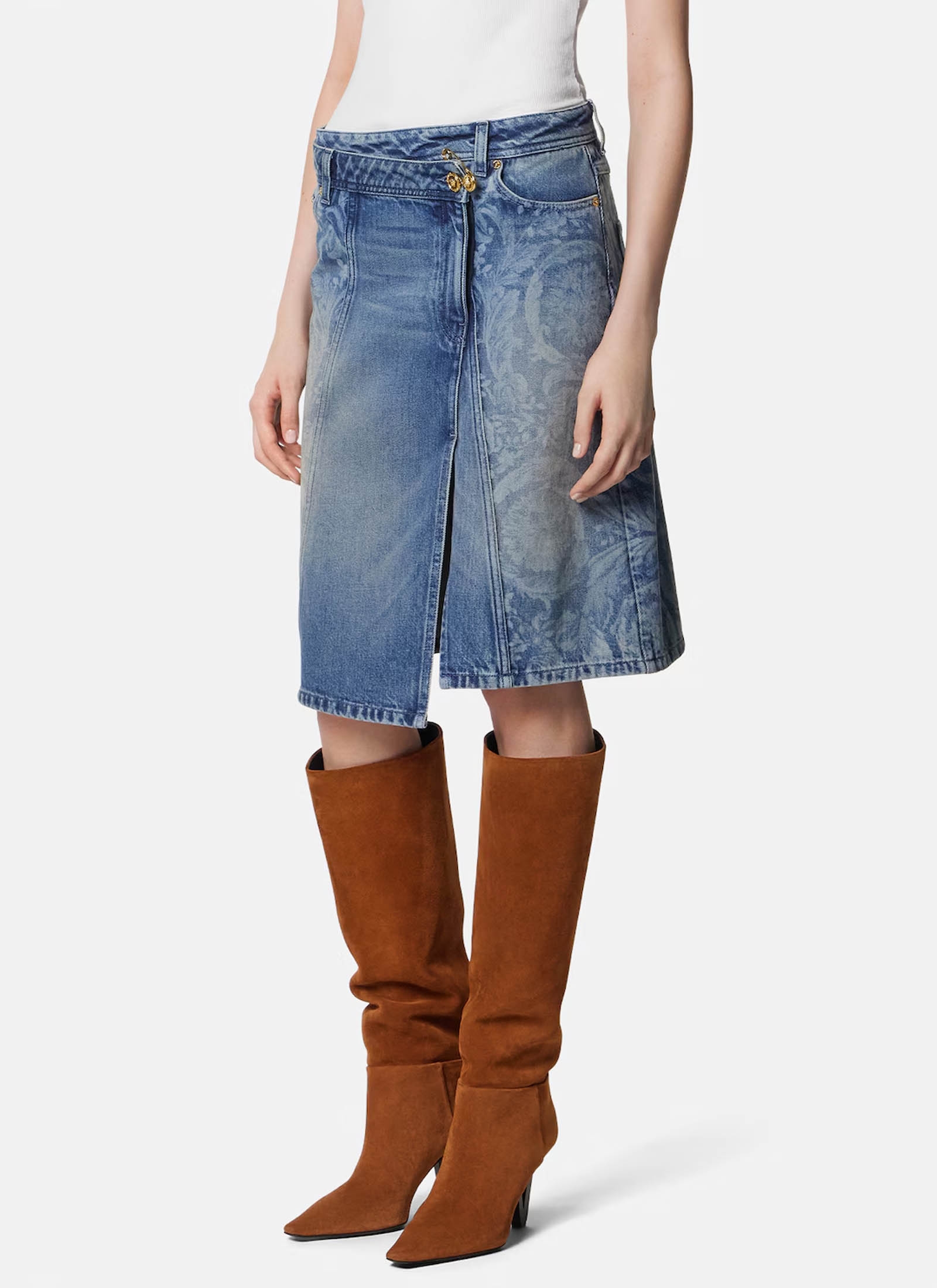 An asymmetrical denim skirt with a matching Barocco print, accented with a Medusa button and detachable signature Safety Pin.