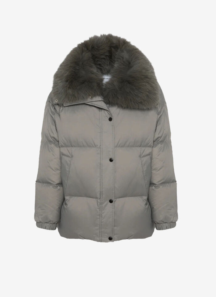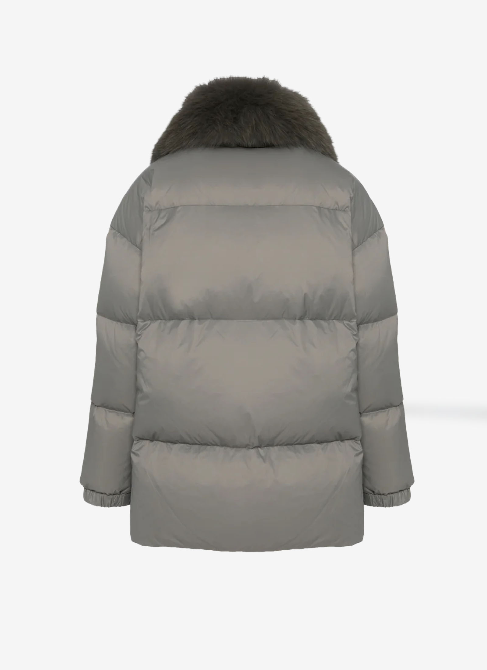 This A-line down jacket with removable fur is filled with high-quality duck down and feathers for warmth and breathability. It features a classic zipper closure and two slit pockets.