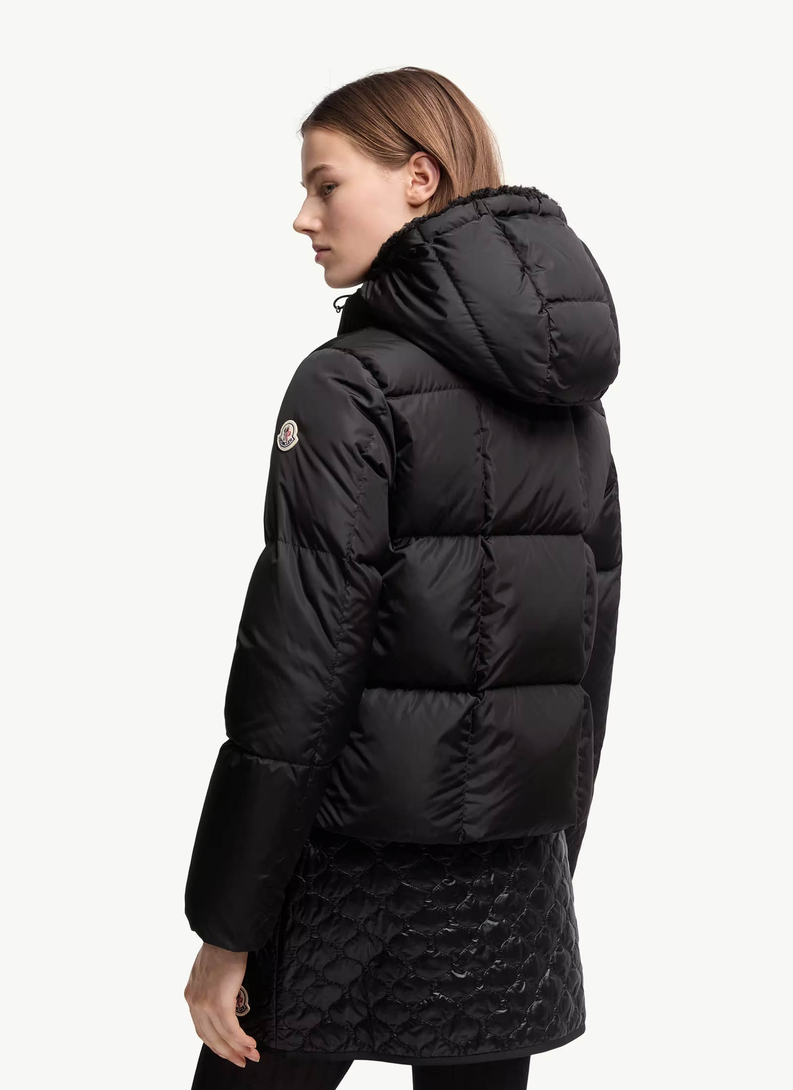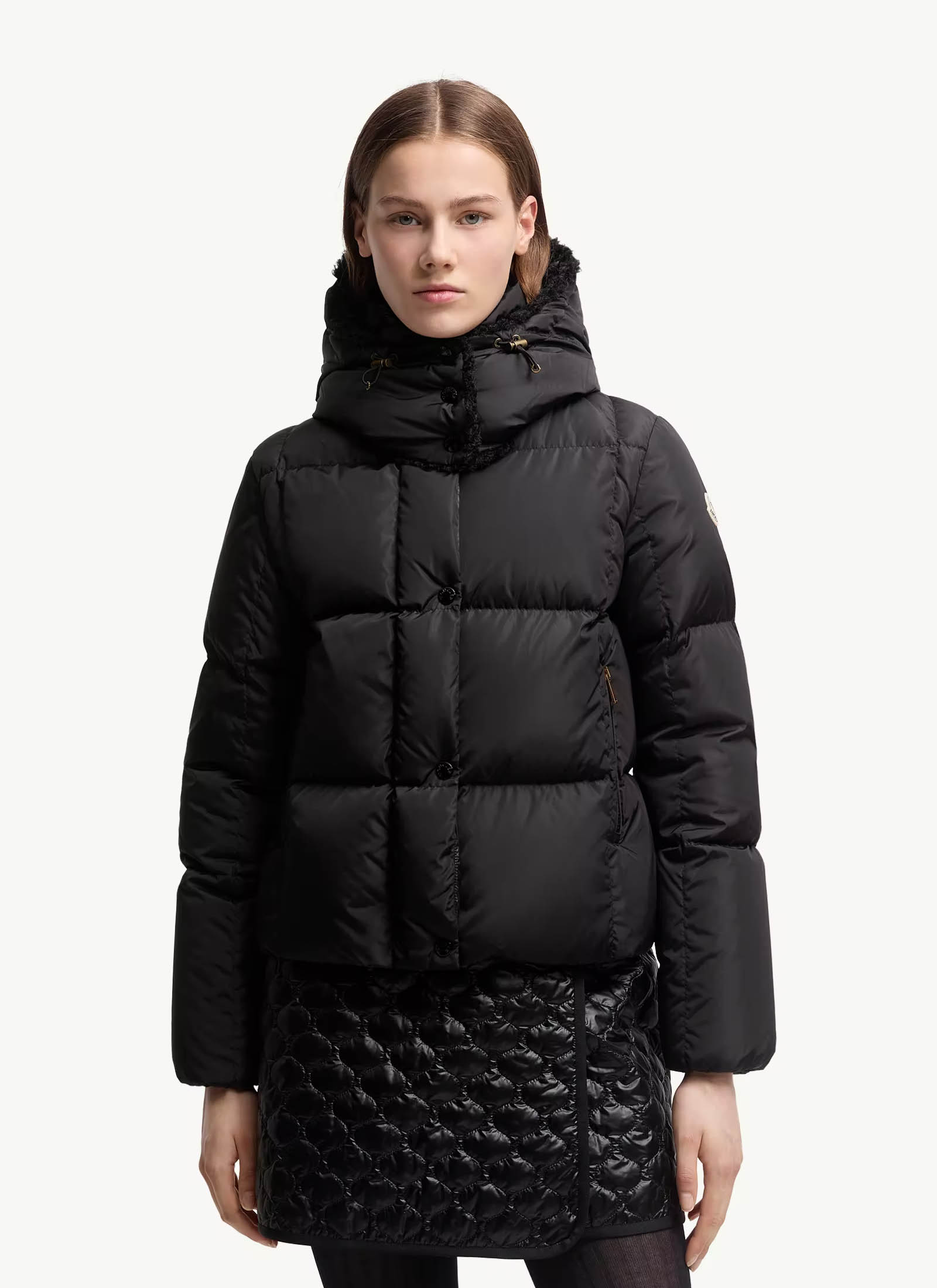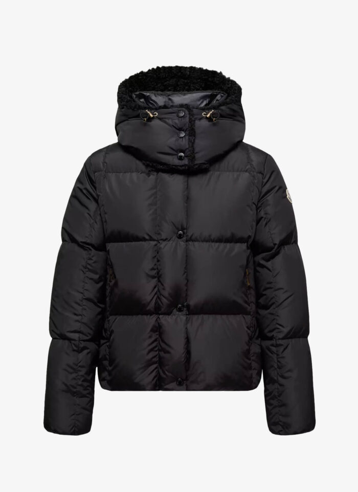 This short down jacket is crafted from nylon, a water-repellent fabric with a silky-smooth texture. A plush fleece lining on the hood adds softness, completing the design.
