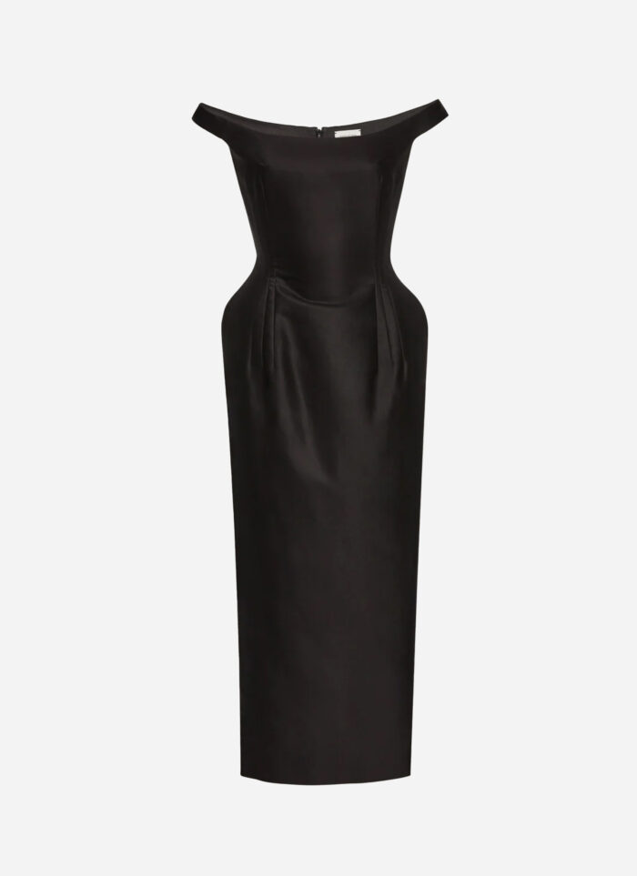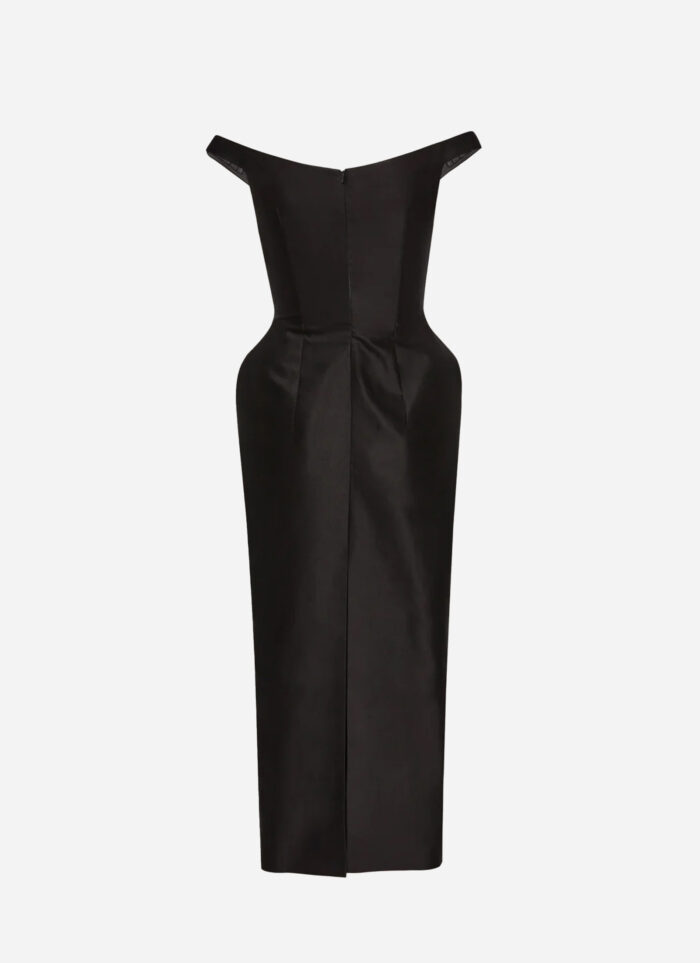 This feminine midi dress is crafted from cotton fabric with a silk lining and creates an hourglass silhouette with padded hips and a fitted bodice, complete with a rounded, off-the-shoulder neckline.