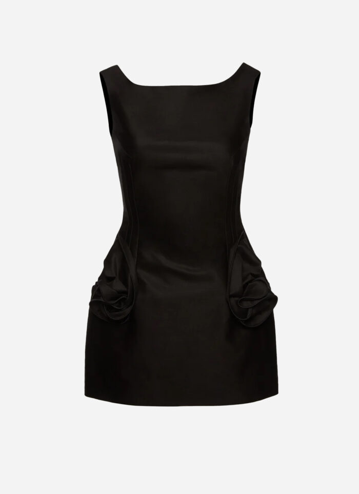 Embellished with rose appliques at the hips and a high neckline.