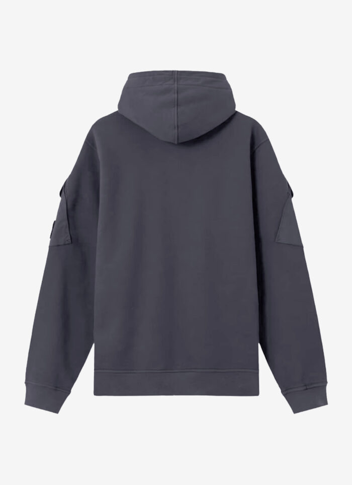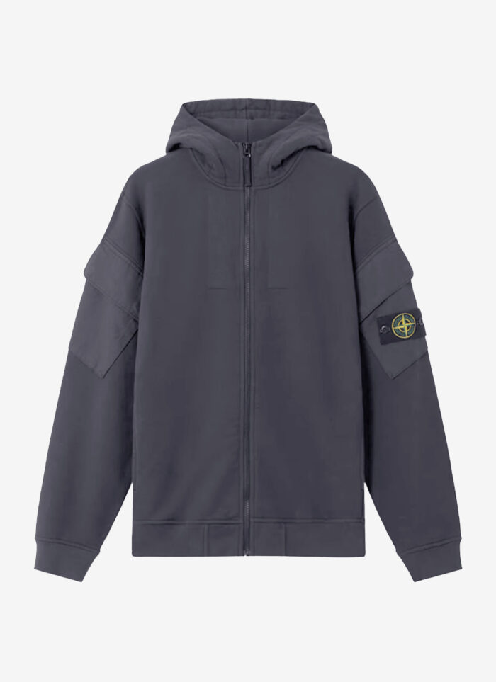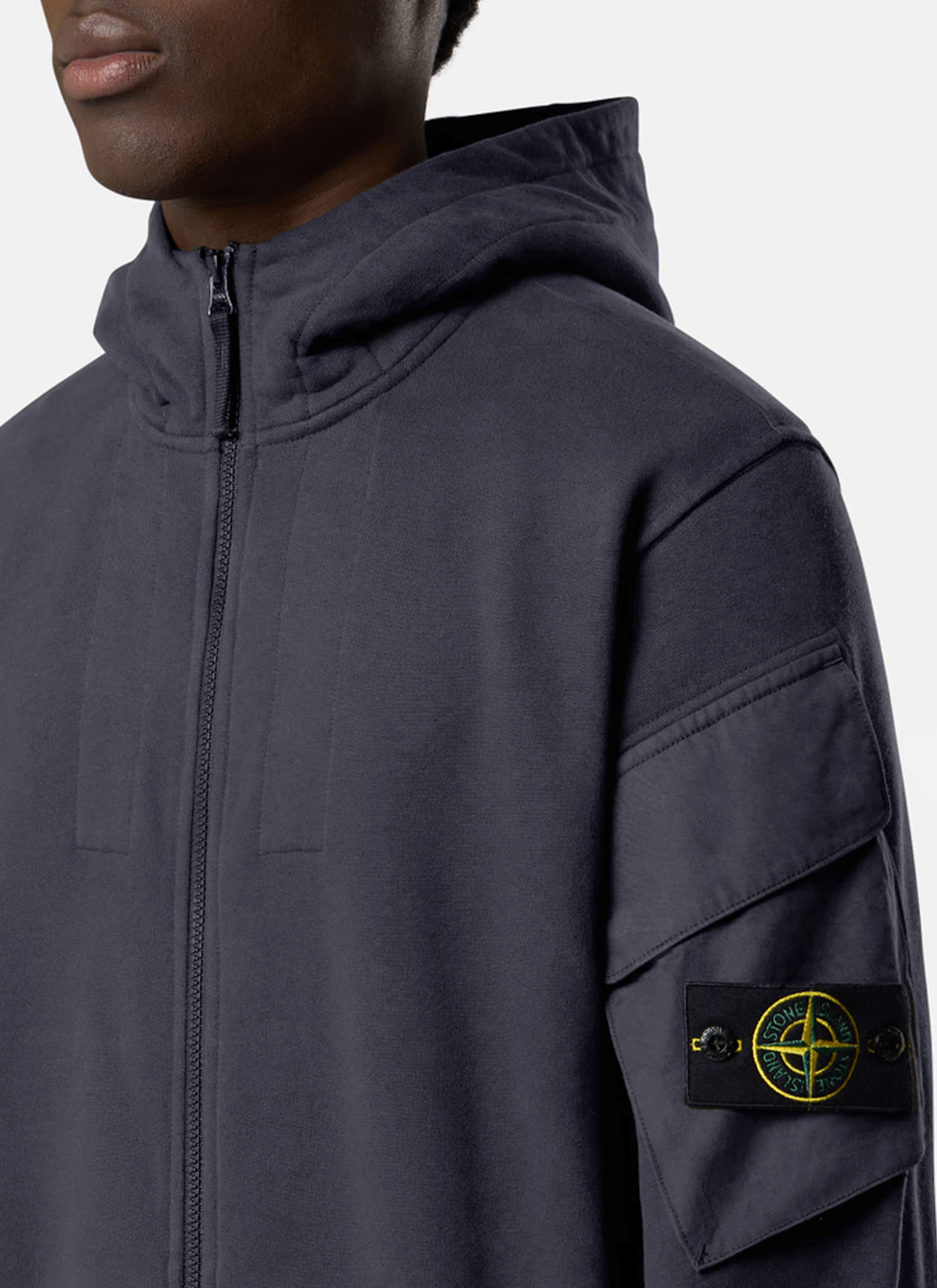 This zip-up hooded jacket made of brushed organic cotton fleece features sleeve pockets, handwarmer pockets, and elastic ribbed cuffs. A Stone Island logo is featured on the left sleeve. Garment-dyed finish.