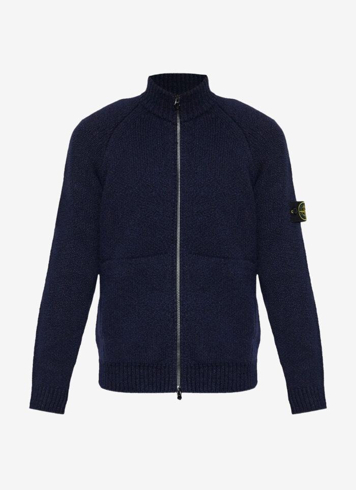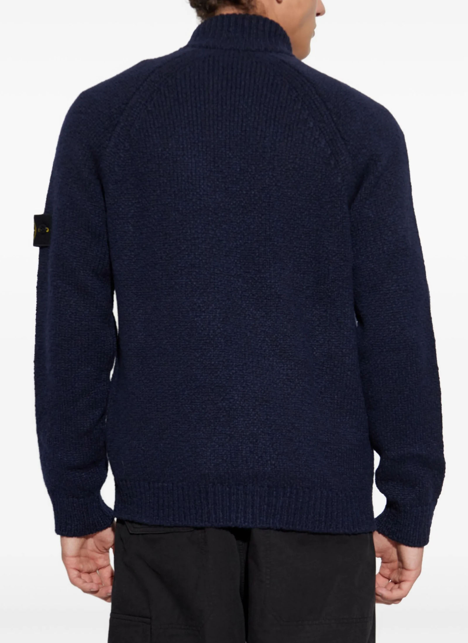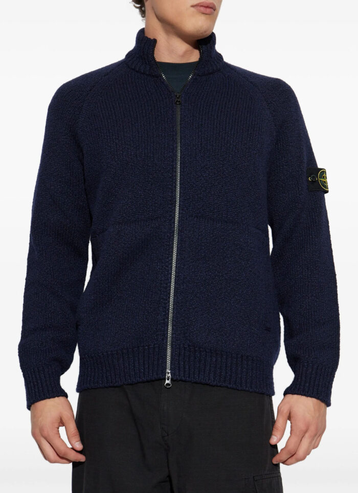 A knitted, solid-color, zip-up jumper made from floss wool and nylon with a stand-up collar, raglan sleeves, and a two-way zip. Count 3.