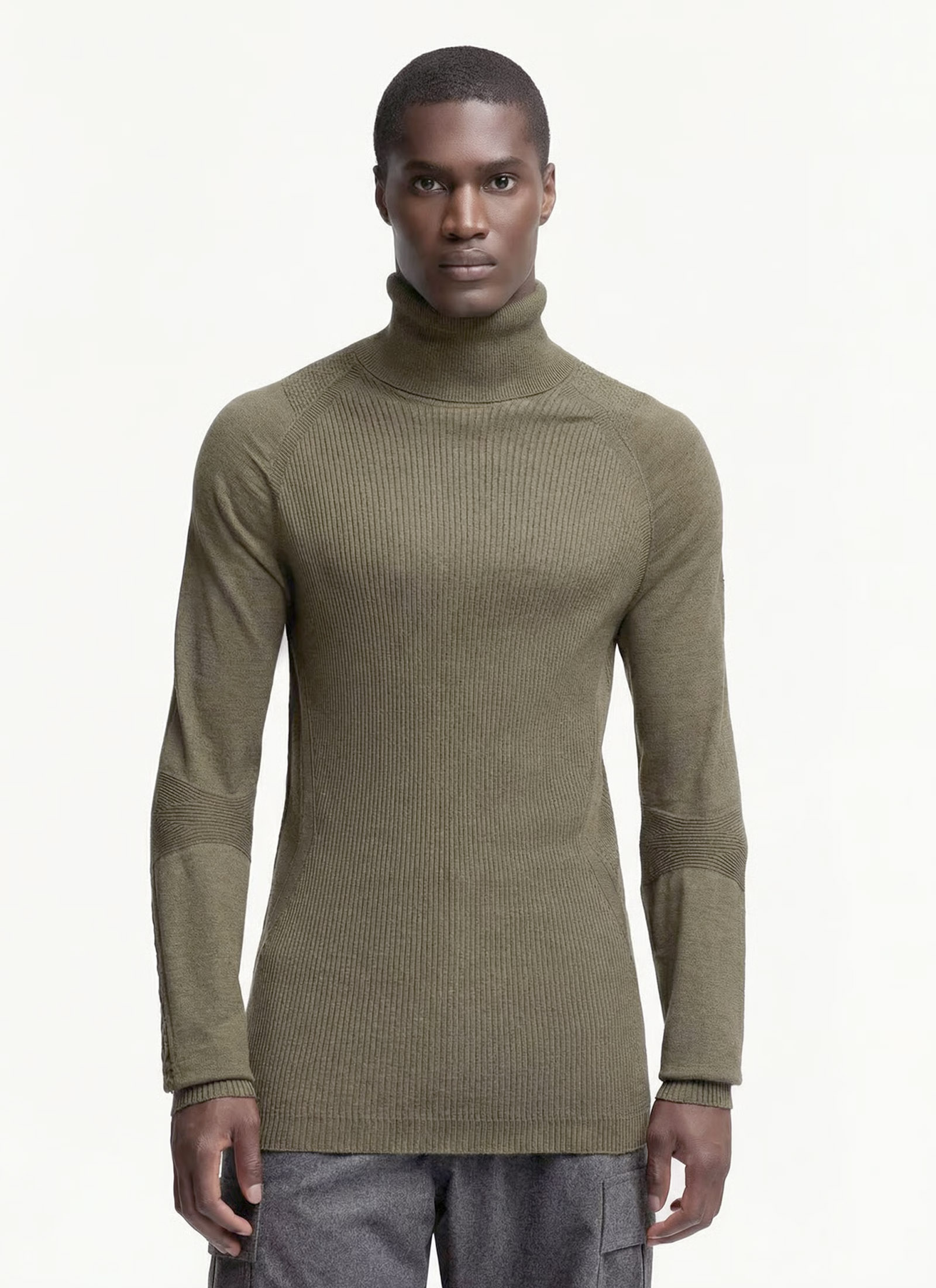 This solid color turtleneck is made from a stretchy wool blend.