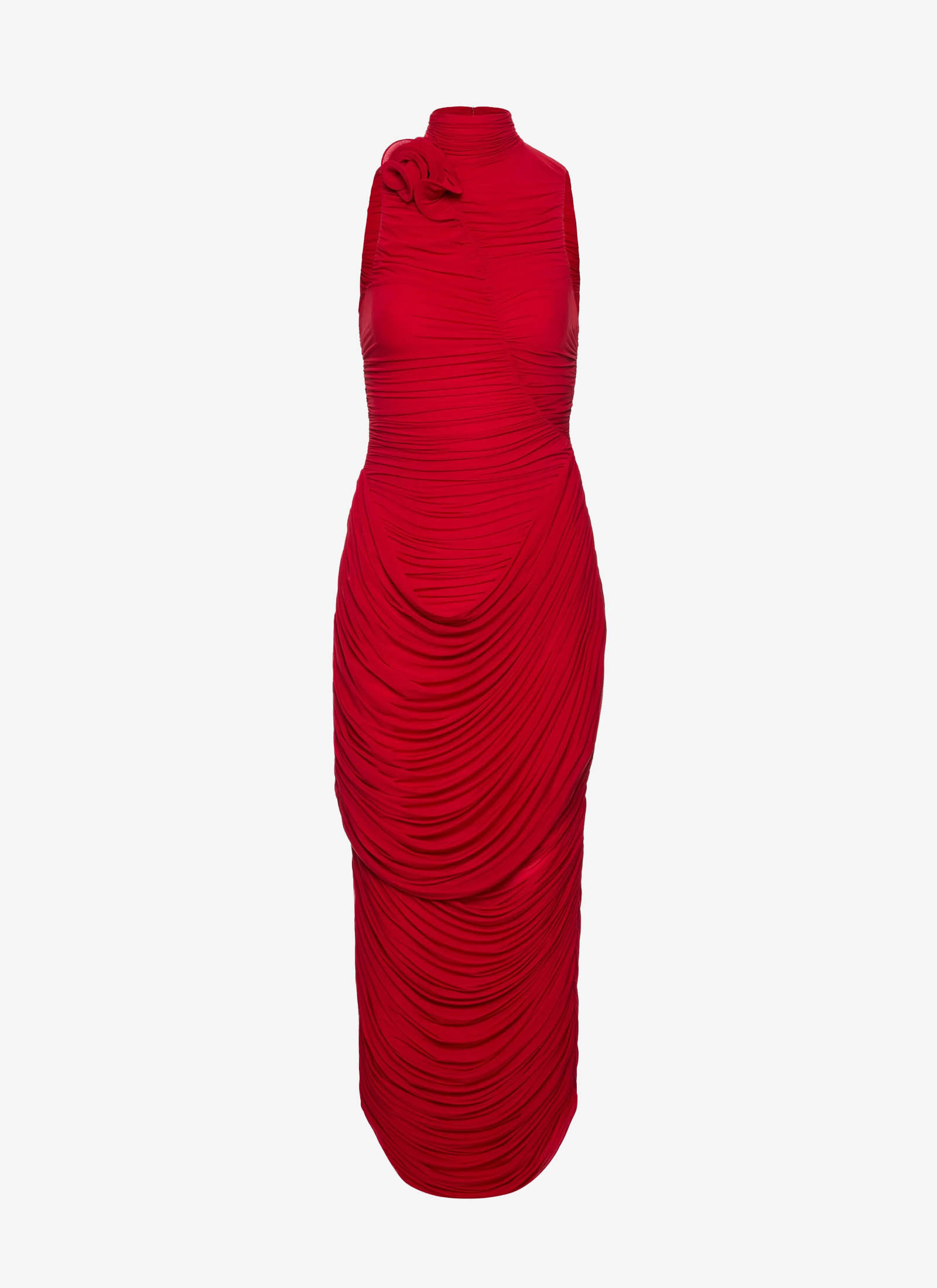 Сукня середньої довжини з вирізом у формі ключової дірки, прикрашеною аплікацією квітки. Має елегантний силует, непомітні бічні кишені та застібку-блискавку ззаду.