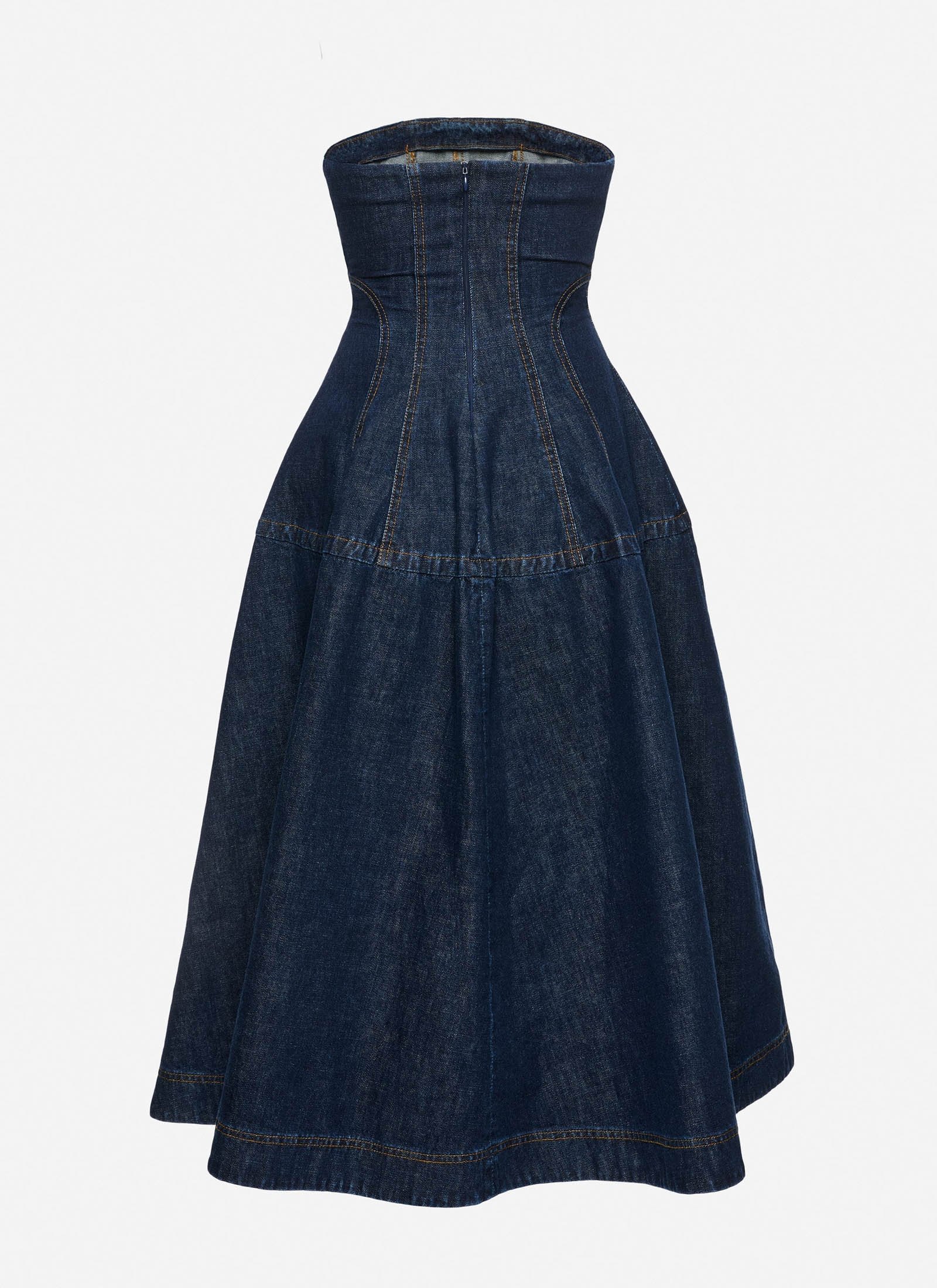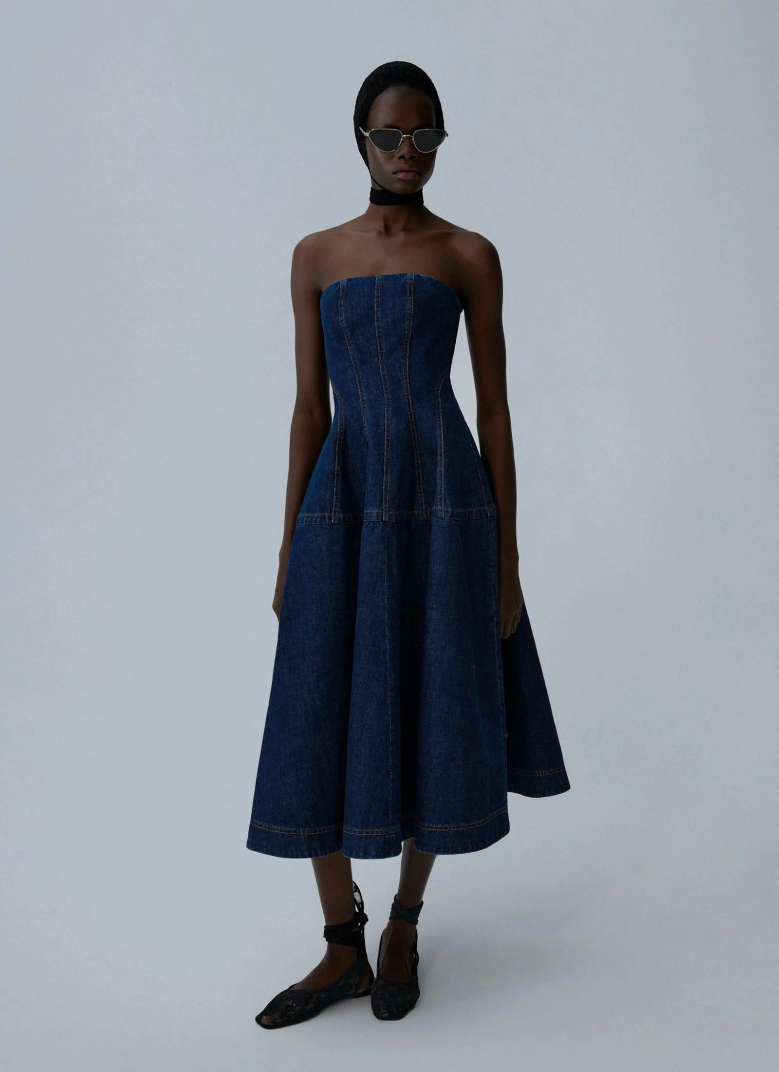 Джинсовий сарафан-сукня середньої довжини скроєно із щільного деніму з корсетом, що підкреслює фігуру, що затягується на талії. Вертикальні шви та відстрочка підкреслюють силует «пісочний годинник», а спідниця розширюється до об’ємної А-подібної форми, створюючи ефектний рух.