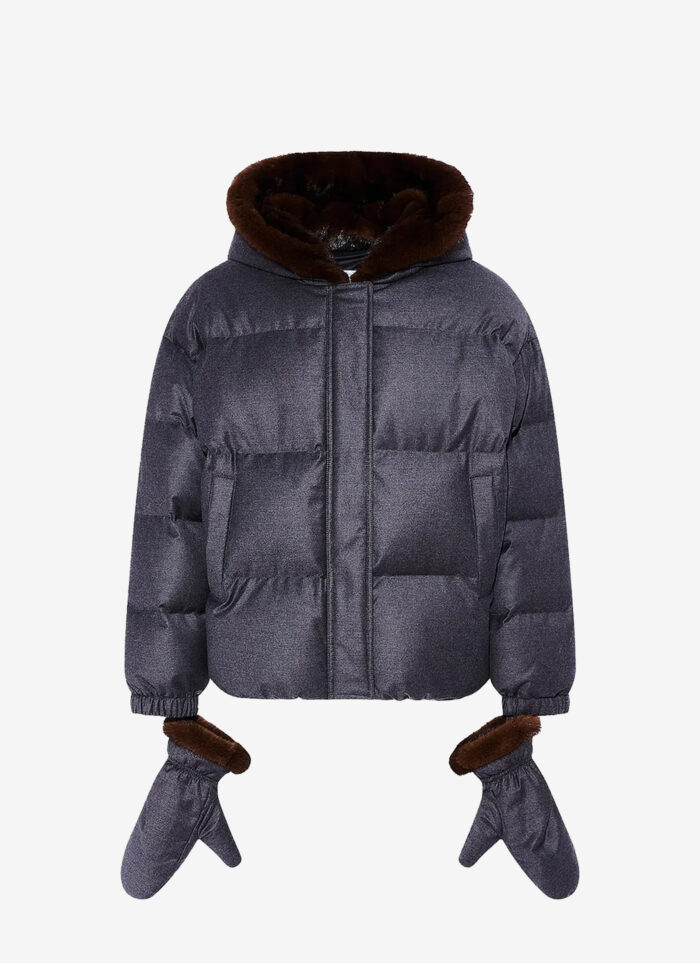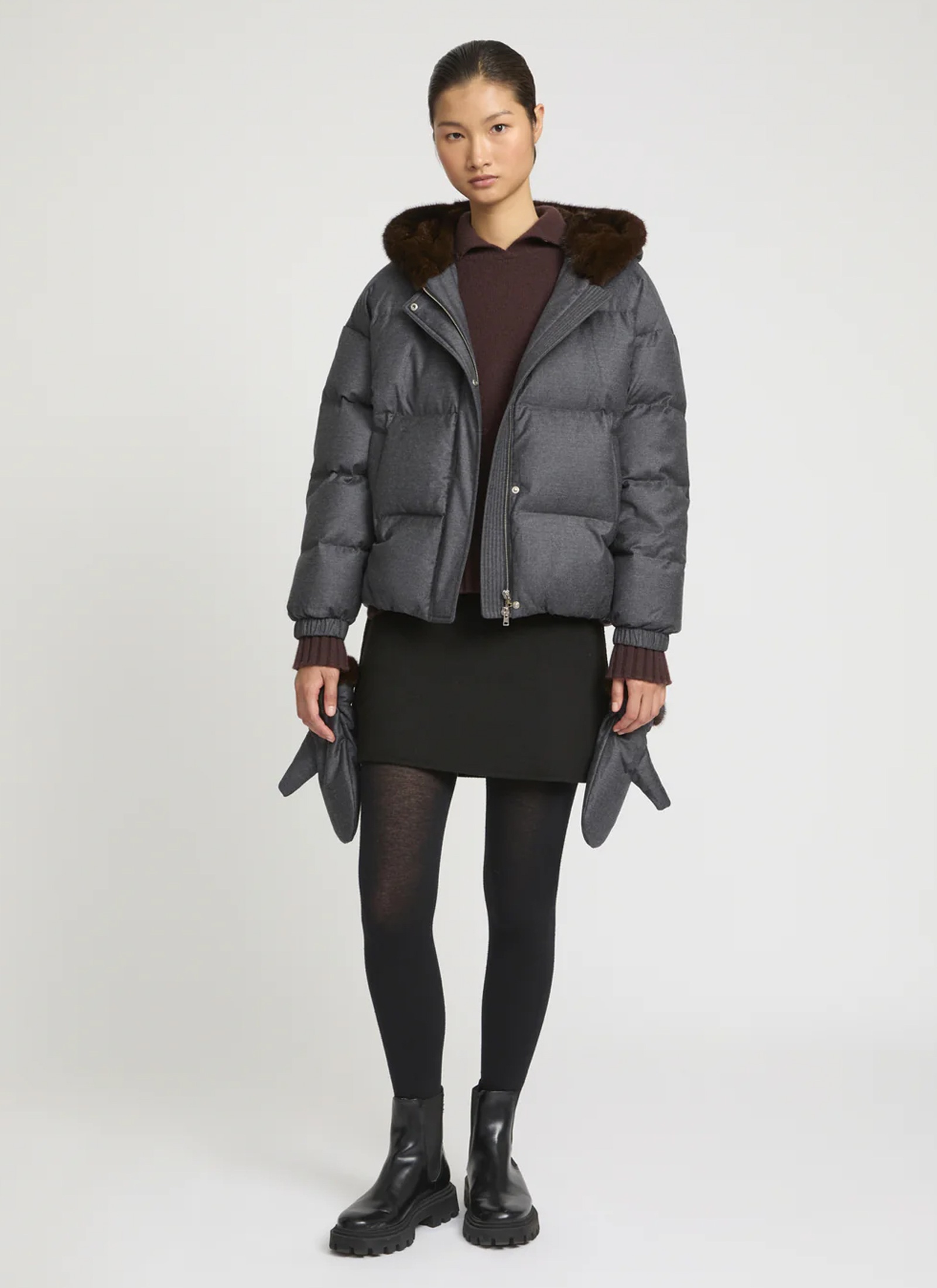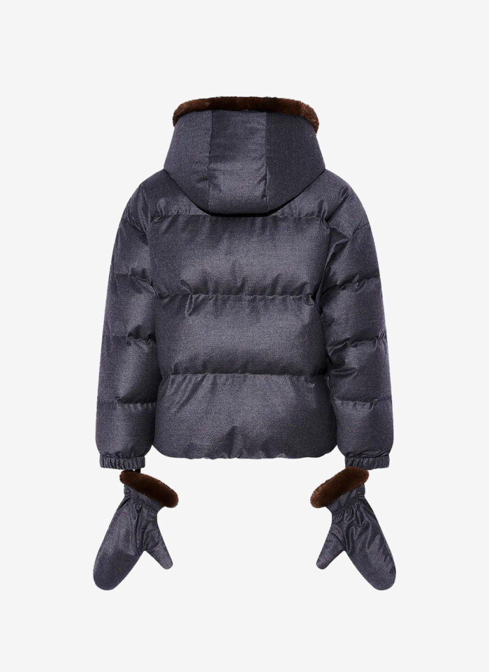 Коротка куртка-пуховик з тканини Loro Piana з внутрішнім капюшоном та обробкою з м’якого, але міцного норкового хутра стануть ідеальним вибором на зиму завдяки своїм захисним властивостям. Тканина виготовлена за технологією Storm System, яка забезпечує абсолютний захист від негоди.