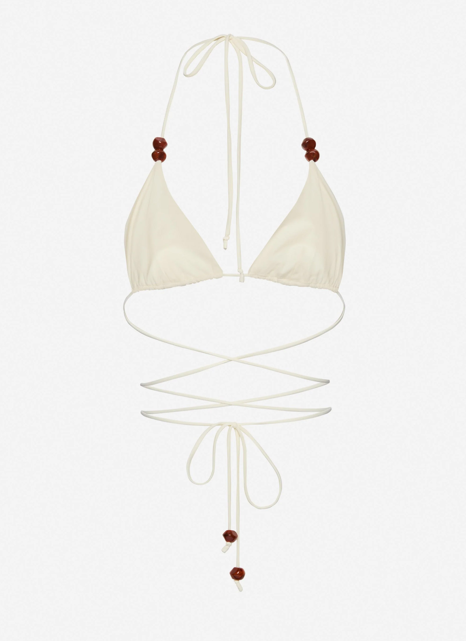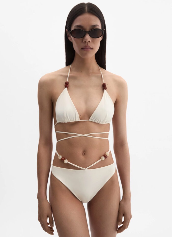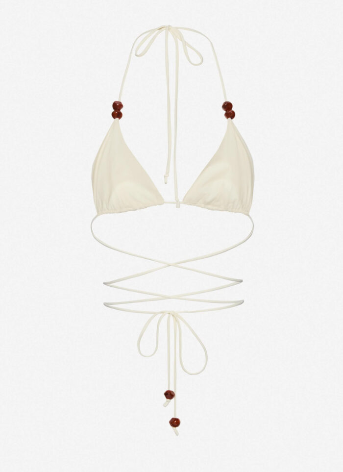 Класичний топ трикутної форми з подовженими бретелями, які перехрещуються на талії, та регульованими чашками трикутної форми без наповнювача. Прикрашений бісером.