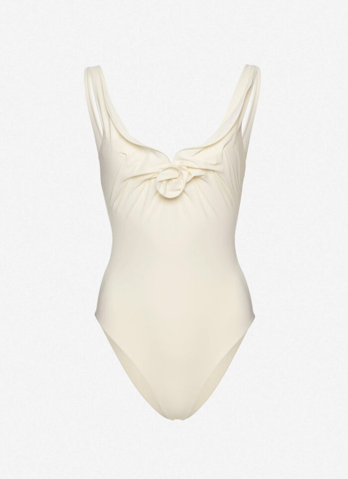 Цілісний купальник з м’яко драпірованим вирізом, прикрашений квітковим рюшем спереду. Скульптурний силует наголошує на фігурі, а виріз на спині додає чуттєвості.