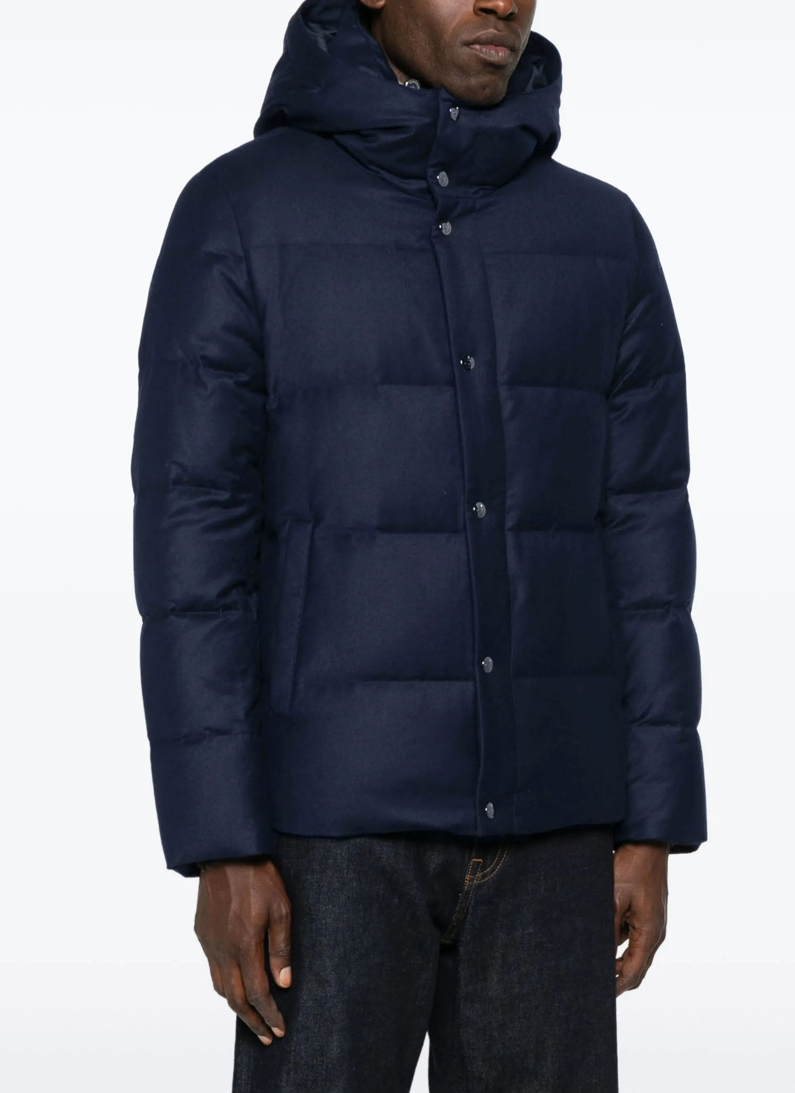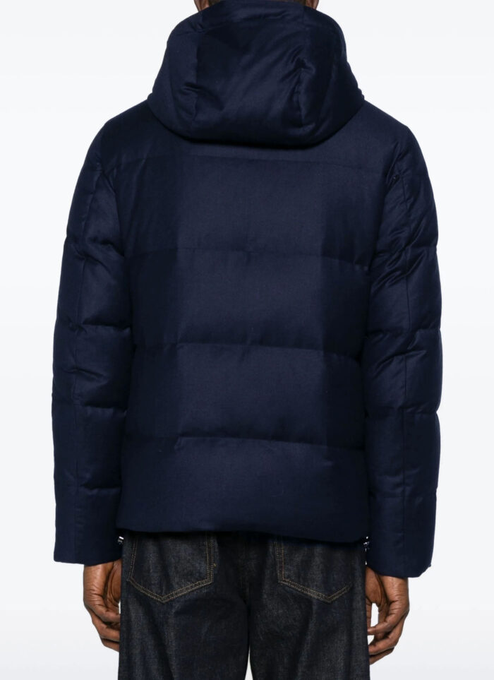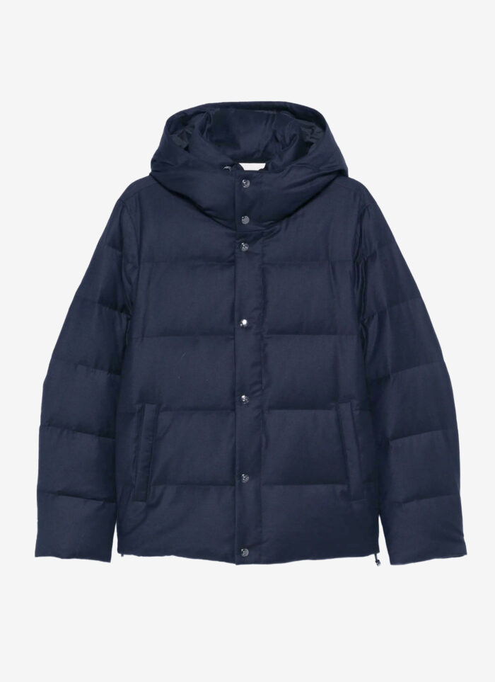 Однотонна куртка-пуховик з вовни з капюшоном, застібкою на блискавку та кнопки, зі спеціальною обробкою, що робить її водовідштовхувальною.