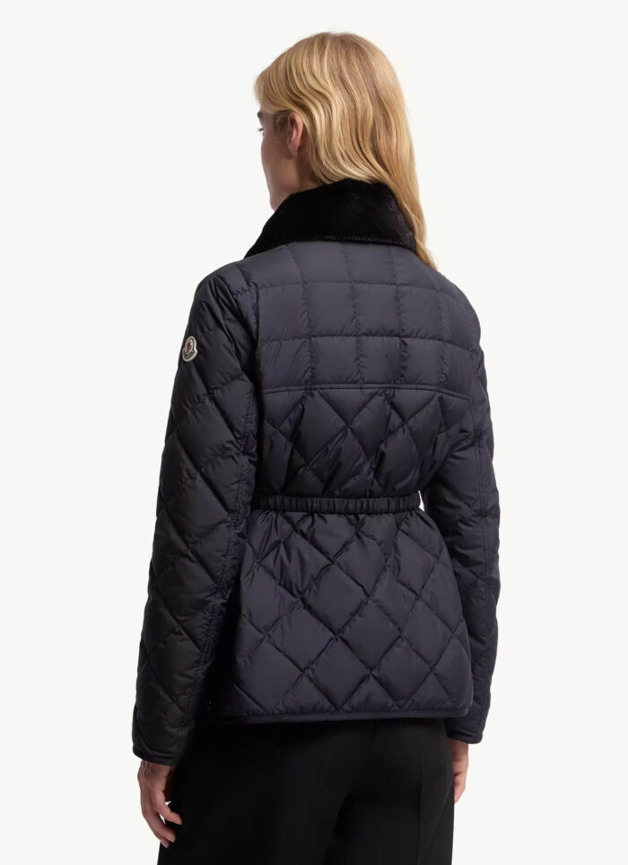 Цей короткий пуховик виконаний з переробленого поліестеру відрізняється геометричним стьобаним і звуженим силуетом з поясом, доповнений знімним коміром зі штучного хутра. Краї з оксамитовим оздобленням. Класична застібка на кнопках.