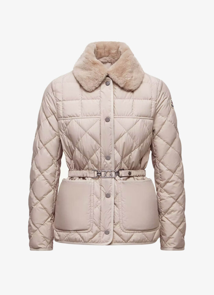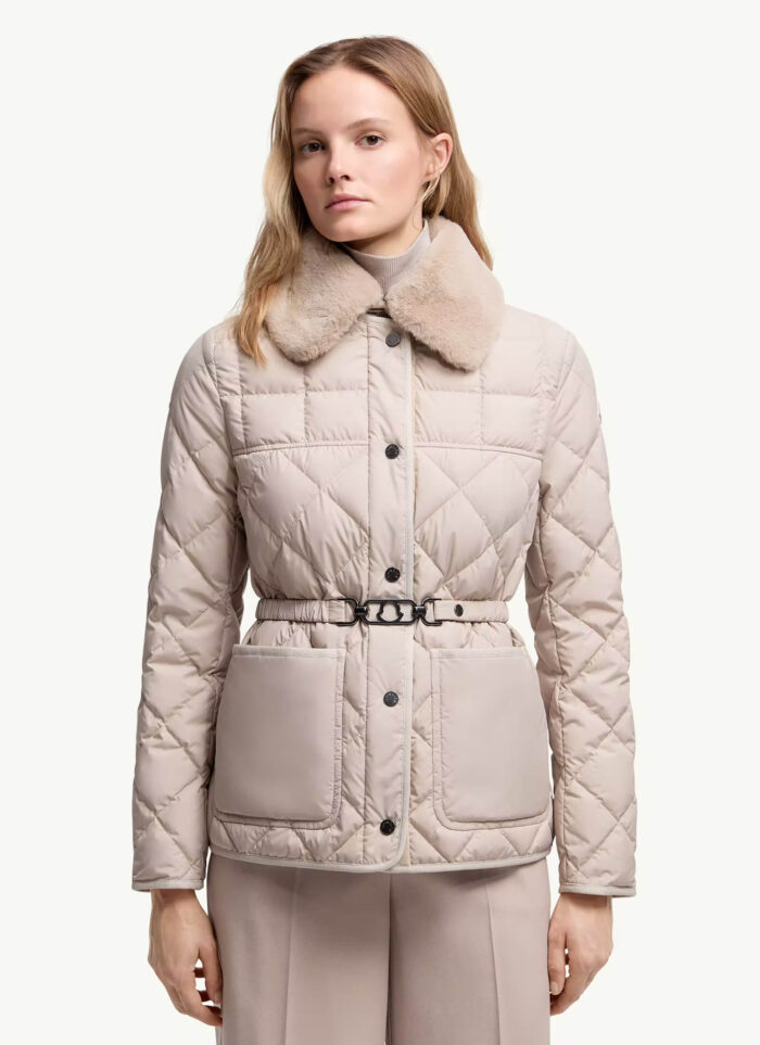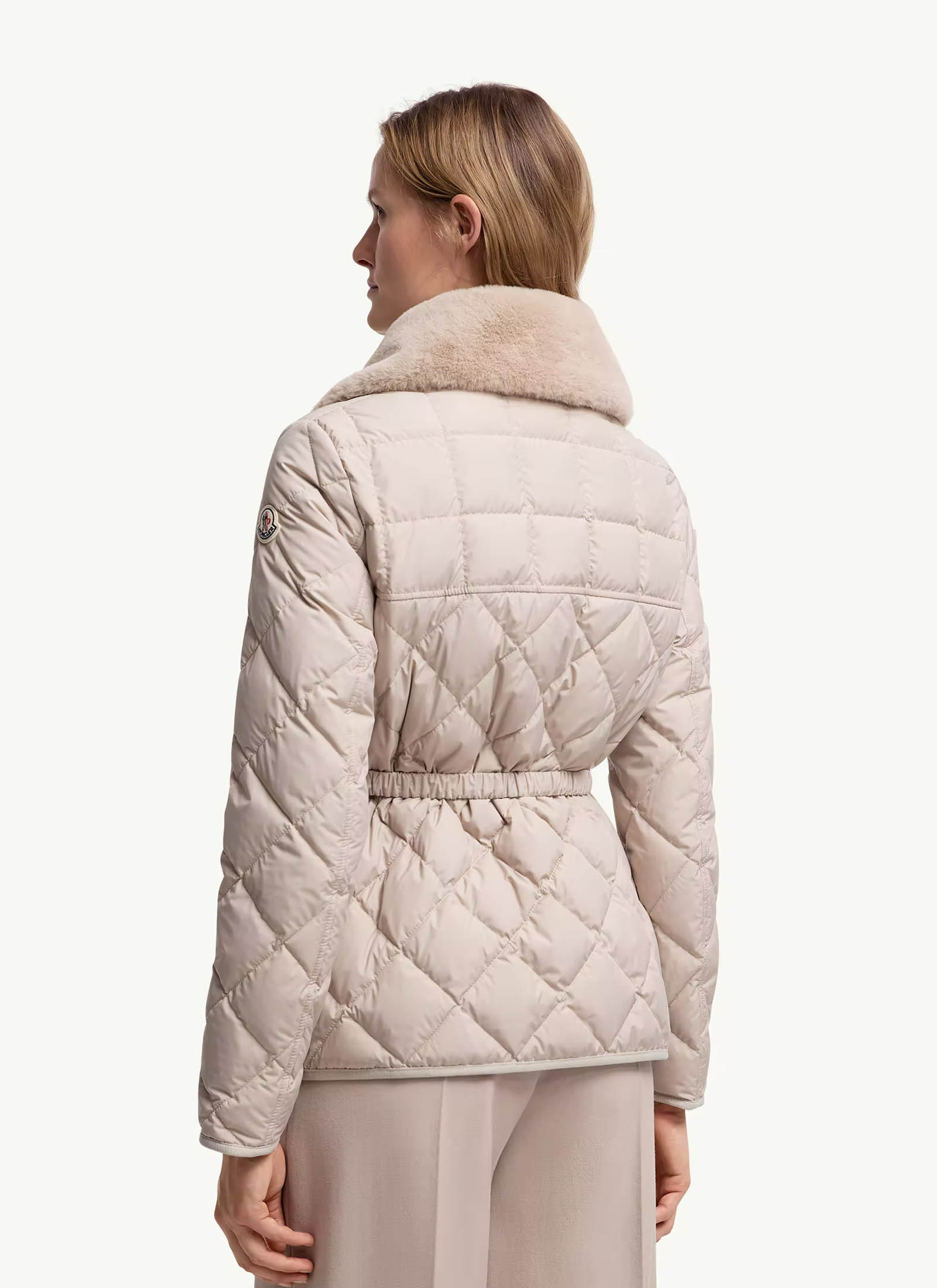 Цей короткий пуховик виконаний з переробленого поліестеру відрізняється геометричним стьобаним і звуженим силуетом з поясом, доповнений знімним коміром зі штучного хутра. Краї з оксамитовим оздобленням. Класична застібка на кнопках.