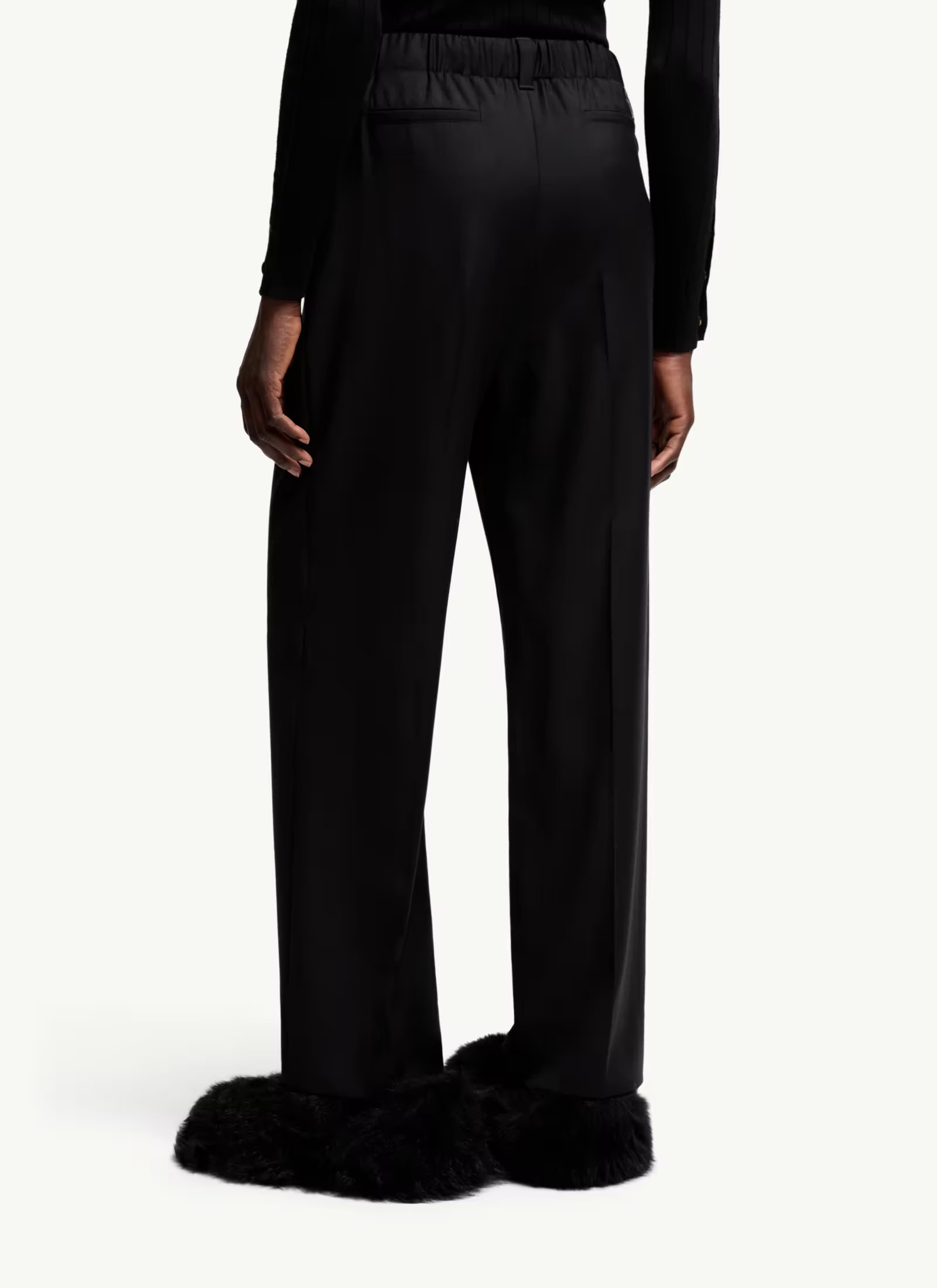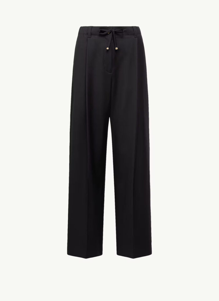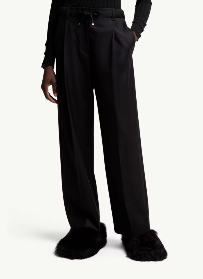 Ці штани з вовняного габардину із запрасованими складками спереду створюють індивідуальний силует. Низ штанів має регульовану талію, що забезпечує зручну посадку. Застібка на блискавку та кнопку. Бічні кишені. Шкіряна нашивка з логотипом позаду.