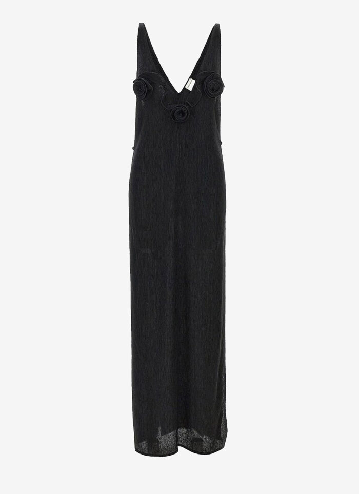 Сукня довга максі з текстурованого крепу з глибоким V-подібним вирізом, прикрашеним об’ємними аплікаціями у вигляді троянд, і високими розрізами з боків, що застібаються на ґудзики на талії.