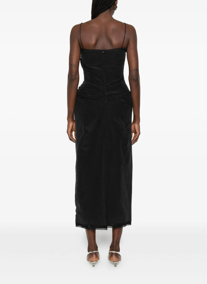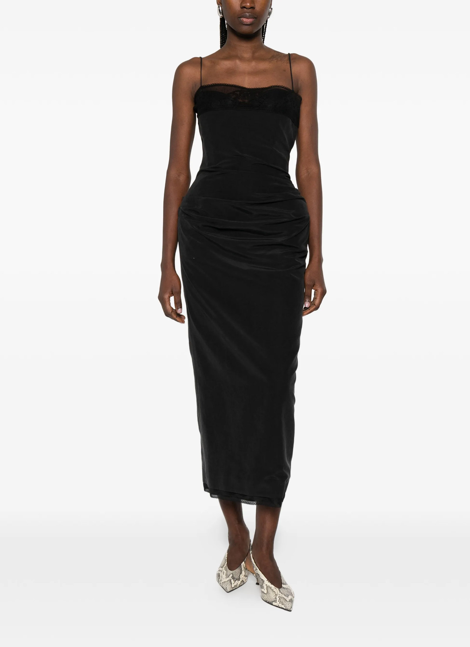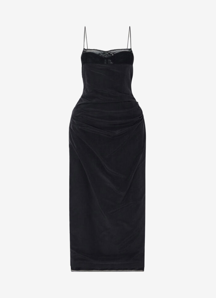 Шовкова сукня середньої довжини, має тонкі бретелі та прямий виріз, оздоблений ніжним мереживом. Вбудований корсет надає форми і злегка проглядається через мереживну вставку спереду. Силует м’яко драпірований зборами з боків та ззаду, підкреслюючи фігуру. Стегна підкреслені внутрішньою підкладкою. Застібається ззаду на потаємну блискавку. Внутрішній поділ прикрашений шовковою планкою, оточеною тонким мереживом.