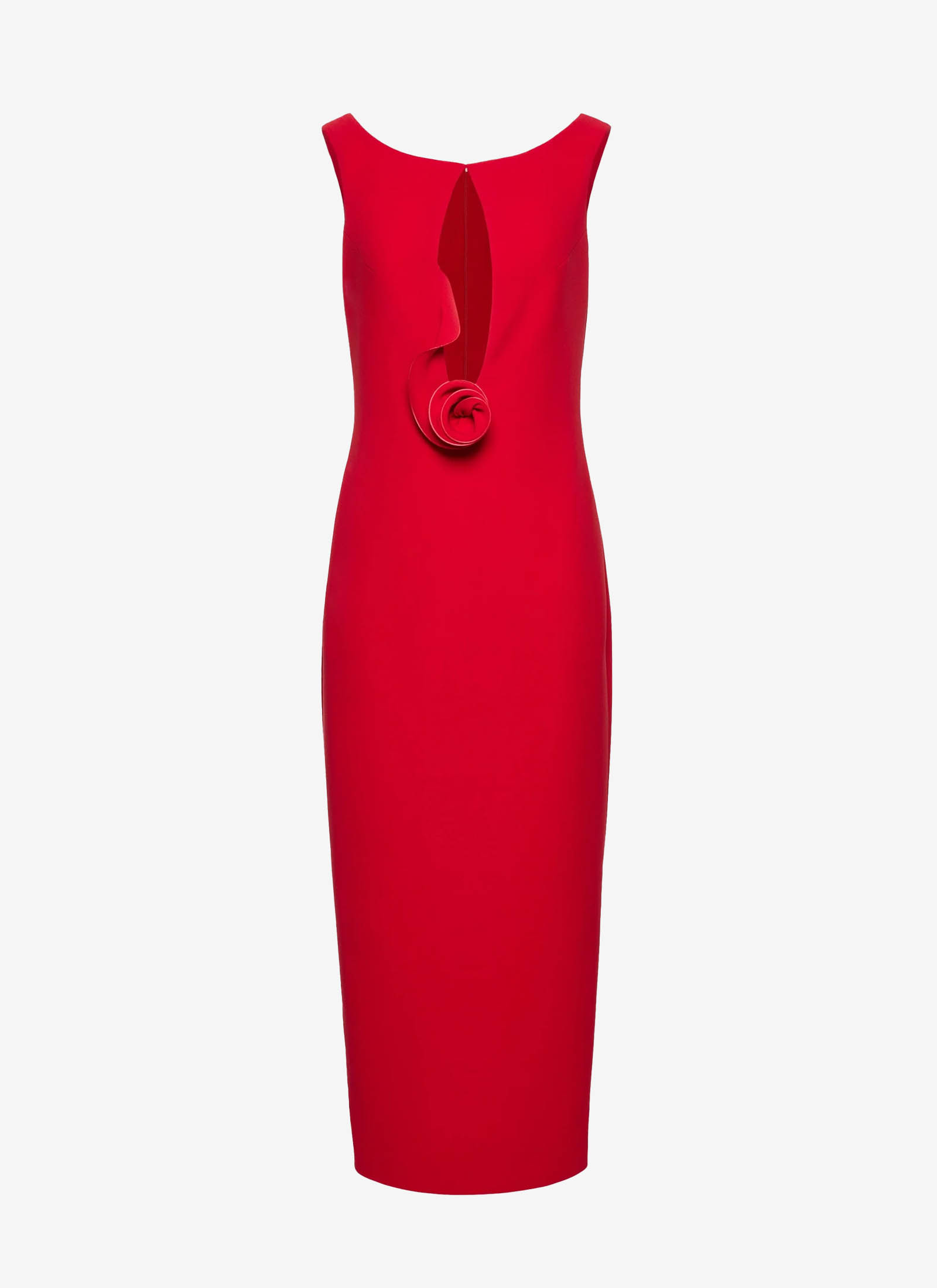 Укорочена сукня з бавовняної та шовкової тканини з широким воланом по низу. Модель прикрашена квітковим візерунком по всій поверхні, медальйоном тон-в-тон і мотивом Paisley.