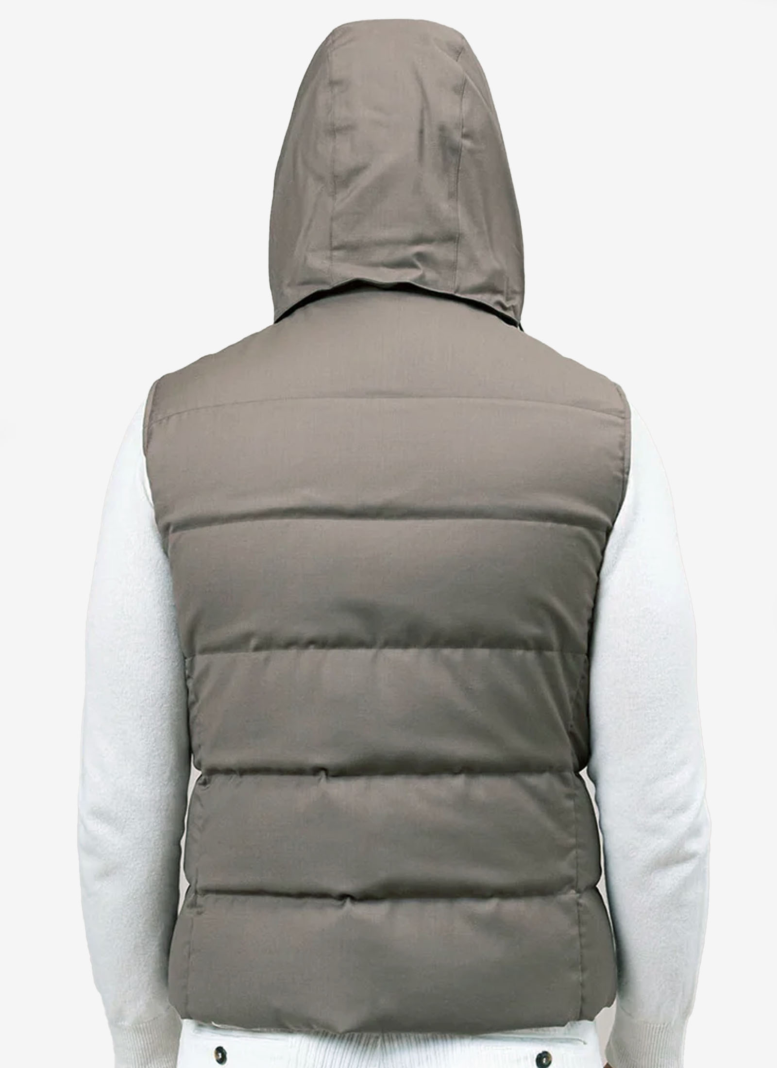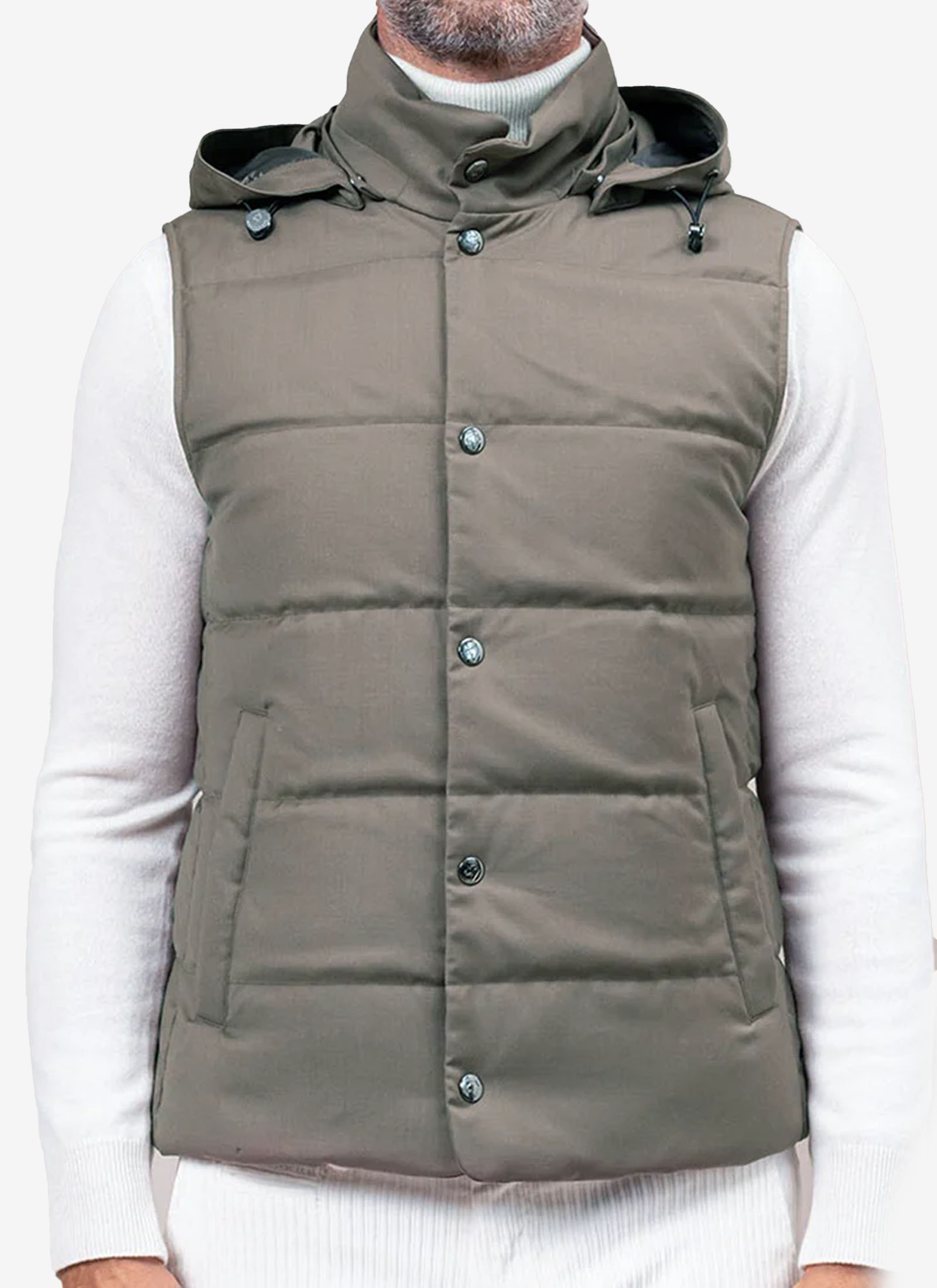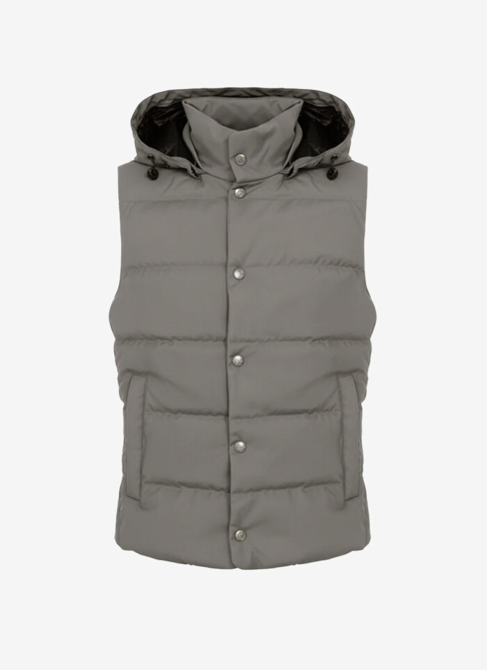 Жилетка-пуховик зі знімним каптуром, застібка на кнопки. Спеціальна обробка робить її водовідштовхувальною.